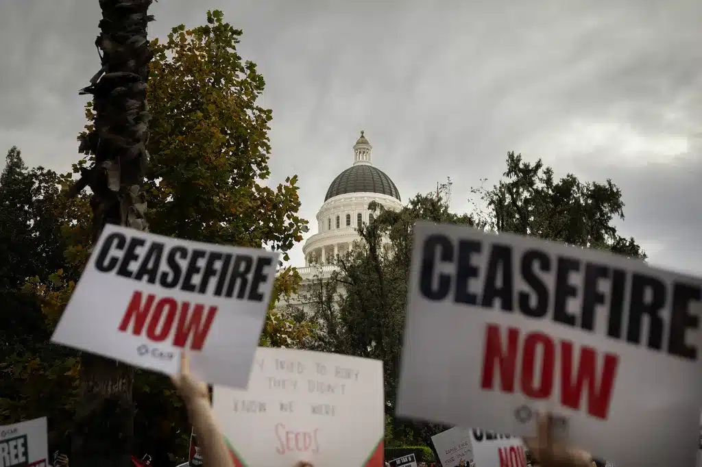 Organizaciones humanitarias y de derechos humanos en San Pedro, California, realizaron una nueva protesta como parte de una serie de manifestaciones semanales para pedir un alto el fuego inmediato en Gaza.